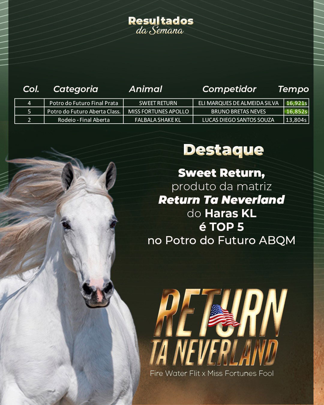 O Haras KL celebrou o desempenho de Sweet Return (Tres Seis x Return Ta Neverland por Fire Water Flit) como destaque no 46º Potro do Futuro ABQM, potra da produção de Return Ta Neverland. Correndo sob o comando do treinador Eli Marques, Sweet Return disputou a Final Prata do PF e ao finalizar sua passada em 16,921s, garantiu a 4ª posição entre os mais de 190 potros participantes.